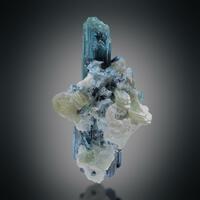 A vivid blue tourmaline crystal stands sharply defined, its striated prism rising with excellent clarity. The reverse hosts lustrous mica plates, adding texture and contrast that frame the piece beautifully.