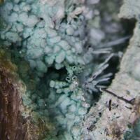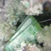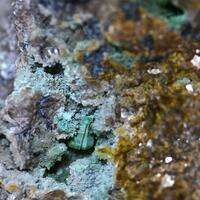 A granite matrix with cavities lined with pale blue and mint green ferrian turquoise variety rashleighite on quartz crystals and fine tourmaline, variety achroite. Also, epimorphs after tourmaline and a tabular mineral, possibly torbernite.