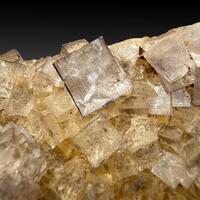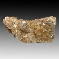 A matrix covered with yellowish to grey untwinned fluorite with slight limonite discolouration, probably from fine alteration to the myriad pyrite inclusions as zones within the crystal faces.